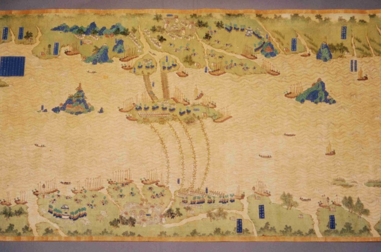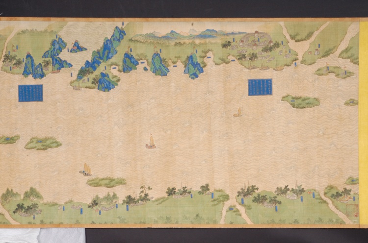 清代,縱59.7厘米,橫1340厘米。采用傳統(tǒng)技法繪制,上南下北,凡江水、港泊、洲渚、城池、村落、林木、山石、舟車、人物、旗幡、軍械均以立體形象呈現(xiàn),飾以石青、石綠等多種顏色。上起九江、下至鎮(zhèn)江,千里區(qū)域中列攔江纜、攔江牌、戰(zhàn)船、木樓、煙墩、駐軍地、營等各種軍事設施,每營均有金書大榜題,記述本營所處位置及兵力布置狀況,每汛的標題上還記有汛與汛之間的里數(shù)。