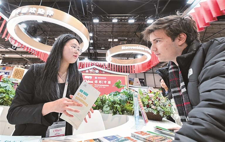 近年來(lái),過(guò)境免簽政策持續(xù)擴(kuò)容、免稅購(gòu)物政策不斷優(yōu)化、“即買(mǎi)即退”適用商店持續(xù)增加……得益于中國(guó)日益開(kāi)放的舉措,越來(lái)越多外國(guó)游客在中國(guó)旅游、購(gòu)物,感受更加開(kāi)放包容、多元?jiǎng)?chuàng)新的中國(guó)。圖為1月21日至25日舉行的馬德里國(guó)際旅游展上,參觀者在中國(guó)展臺(tái)咨詢(xún)。新華社記者 程敏 攝