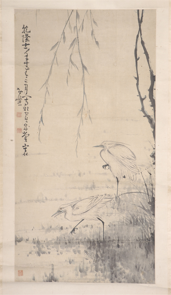 清代,水墨設(shè)色花鳥畫立軸,紙本,作者黃慎??v高1126厘米,橫寬57.4厘米。款署“乾隆十一年春二月寫于蕪成堂寧化黃慎”。鈐“黃慎”白文方印,“癭瓢”白文方印。柳枝自畫面上方垂下,疏落的柳葉隨風(fēng)搖曳。池塘兩只白鷺,一只閉目獨立,一只行走覓食。黃慎,福建寧化人,書畫家,為“揚州八怪”之一。