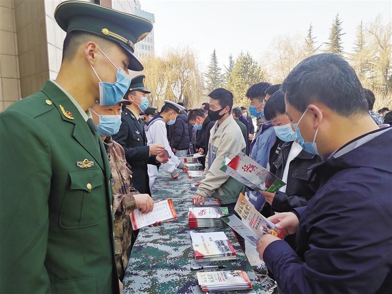 圖為大學(xué)生領(lǐng)取征兵宣傳資料。