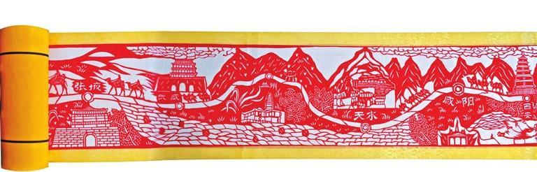 用剪紙藝術(shù)再現(xiàn)古絲綢之路的盛景,國家級非遺項目定西剪紙省級代表性傳承人付忠民經(jīng)過長時間的構(gòu)思和調(diào)研,又歷經(jīng)5個月,終于創(chuàng)作出了長達(dá)23.38米的剪紙長卷——《古絲綢之路全圖》,再現(xiàn)了絲路古道的文化藝術(shù)魅力,該長卷曾一舉創(chuàng)下世界紀(jì)錄協(xié)會“世界上最長的剪紙長卷”的世界紀(jì)錄。