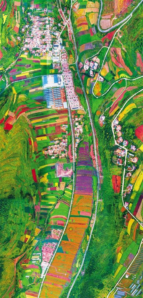 俯瞰渭源縣田家河鄉(xiāng)元古堆村新貌。元古堆村通過(guò)發(fā)展農(nóng)產(chǎn)品加工、鄉(xiāng)村旅游、電子商務(wù)、光伏發(fā)電等產(chǎn)業(yè)實(shí)現(xiàn)脫貧摘帽,日子越過(guò)越紅火。王 濤攝(中經(jīng)視覺)