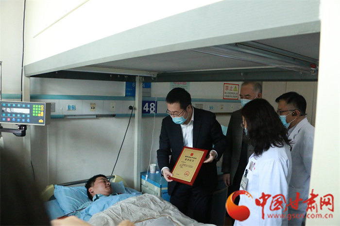 甘肅省紅十字會黨組書記、專職副會長楊芳勝為甘肅省第54例造血干細(xì)胞捐獻(xiàn)者龔先生頒發(fā)“博愛金獎”和榮譽(yù)證書