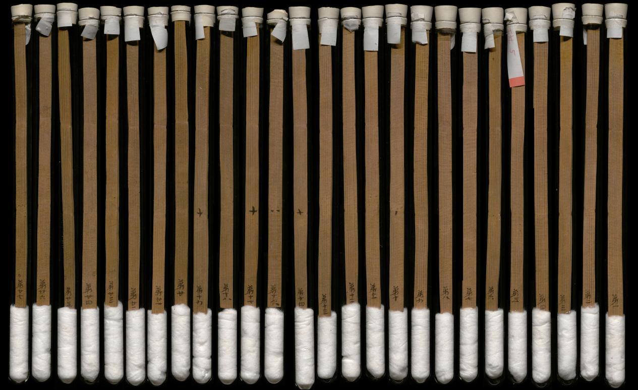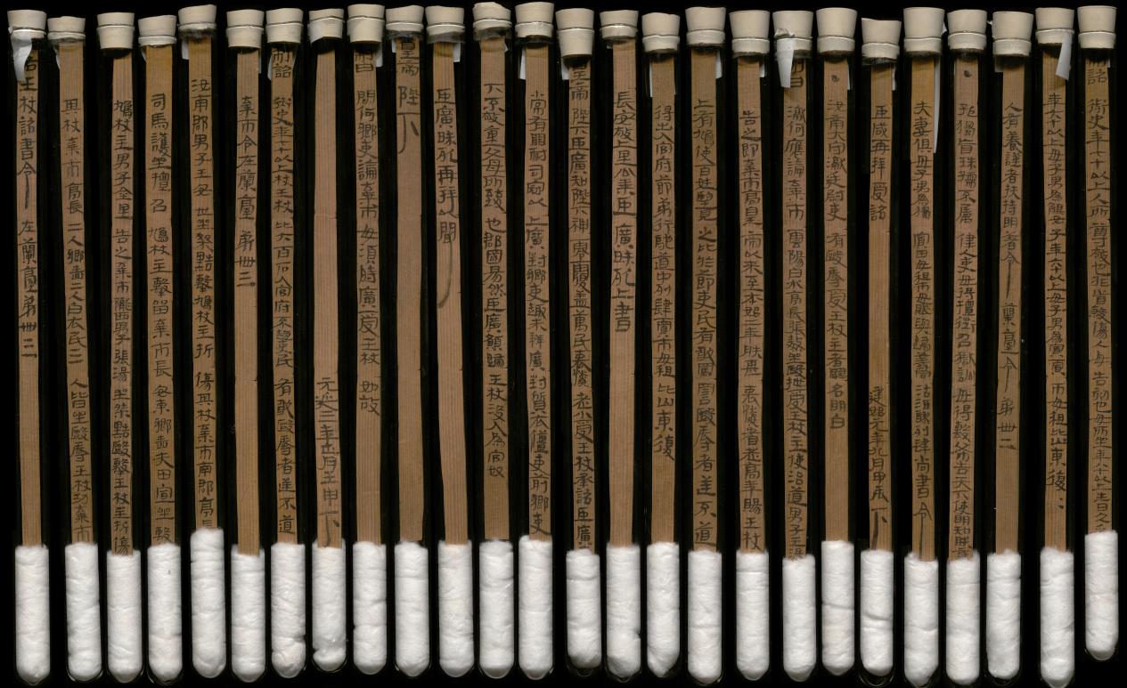 1959年,在武威市涼州區(qū)新華鄉(xiāng)磨嘴子第18號墓中,出土木簡10枚,出土?xí)r懸掛于一鳩杖之上。其內(nèi)容記載了東漢永平十五年(72年)幼伯受王杖事,并錄建始二年(前31年)九月“年七十受王杖”的詔書和和平元年(前28年)毆擊王杖主當(dāng)棄市的令。由于簡上無編號,出土?xí)r次序已亂,史學(xué)界稱其為“王杖十簡”。簡長23.2-23.3厘米,寬1厘米,共有240字。松木削制、兩道編繩、先書后編、墨書隸體、字跡清晰。