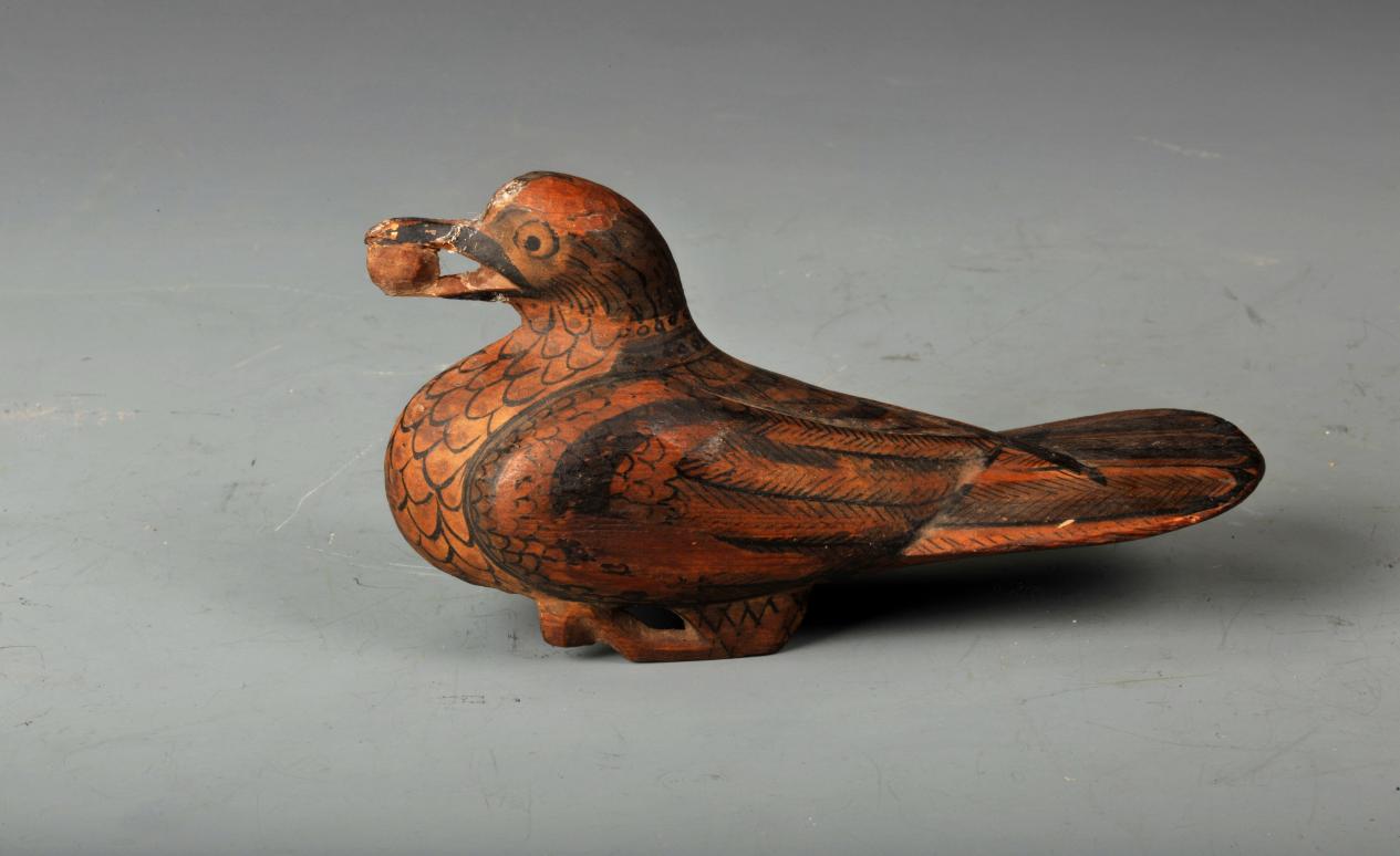 木鳩是王杖的杖首。在武威市博物館里,就有一件國寶級文物漢代彩繪漆木鳩:一只臥姿木質(zhì)鳩鳥,雙目平視,口中含物,兩翼收攏于背部,尾呈平行片狀,兩足曲伸,中有方形卯,為杖桿接榫處。通體墨彩繪制,從頸至腹繪魚鱗狀羽毛,兩翼及尾上部繪魚骨狀羽毛?!逗鬂h書·禮儀志》中記載:“王杖長九尺,端以鳩鳥為飾。鳩者,不噎之鳥也。欲老人不噎。”,“鳩”同于漢字“九”,有九九長壽的寓意;鳩鳥被稱為不噎之鳥,表達(dá)了對老人吃飯不噎、身體康健的美好祝愿。