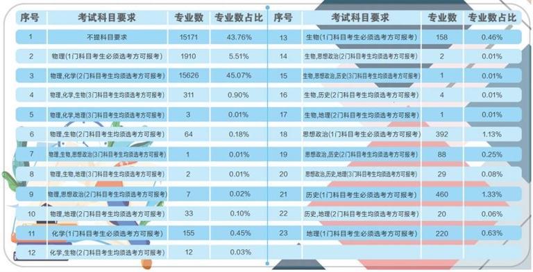 據(jù)了解,根據(jù)《甘肅省深化高等學(xué)??荚囌猩C合改革實(shí)施方案》要求,從 2021年秋季入學(xué)的普通高中一年級學(xué)生開始,實(shí)行基于統(tǒng)一高考和高中學(xué)業(yè)水平考試成績、參考綜合素質(zhì)評價的高校考試招生模式。到2024年,基本形成分類考試、綜合評價、多元錄取的高??荚囌猩贫?,健全促進(jìn)公平、科學(xué)選才、監(jiān)督有力的高??荚囌猩w制機(jī)制。此次在我省報(bào)送選考科目要求的高校專業(yè)共計(jì)64092條,其中本科專業(yè)34670條。專業(yè)選考科目要求共有23種組合,其中不提科目要求的本科專業(yè)數(shù)量占本科專業(yè)總數(shù)的43.76%,含物理科目的占比為51.79%,含化學(xué)科目的占比為46.46%,含歷史科目的占比為1.74%,含“物理+化學(xué)”科目的占比為45.98%。