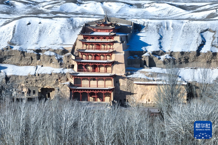 12月15日,甘肅省敦煌市迎來降雪天氣。雪后的世界文化遺產(chǎn)敦煌莫高窟銀裝素裹,景色如畫。新華每日電訊記者 郎兵兵 攝