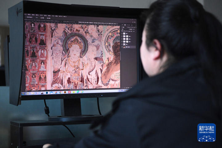 4月25日,敦煌研究院文物數(shù)字化保護(hù)團(tuán)隊(duì)圖像處理人員年海麗在拼接壁畫圖像。新華每日電訊記者 陳斌 攝