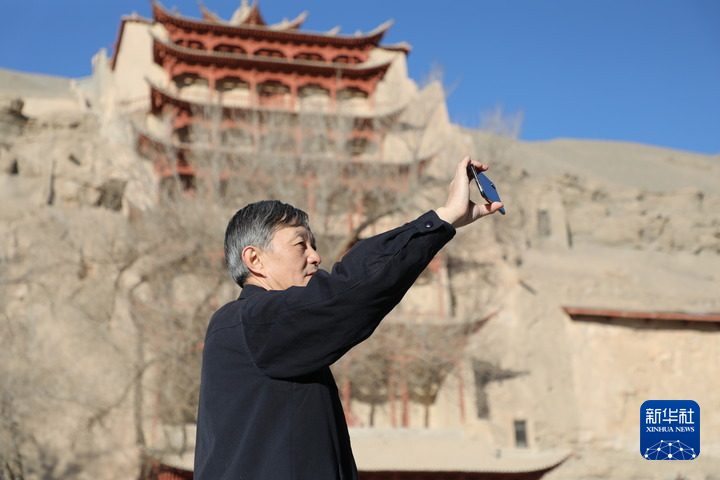 2022年2月23日 敦煌研究院院長蘇伯民正在用手機(jī)進(jìn)行“數(shù)字敦煌”體驗(yàn)。新華每日電訊記者 張睿 攝