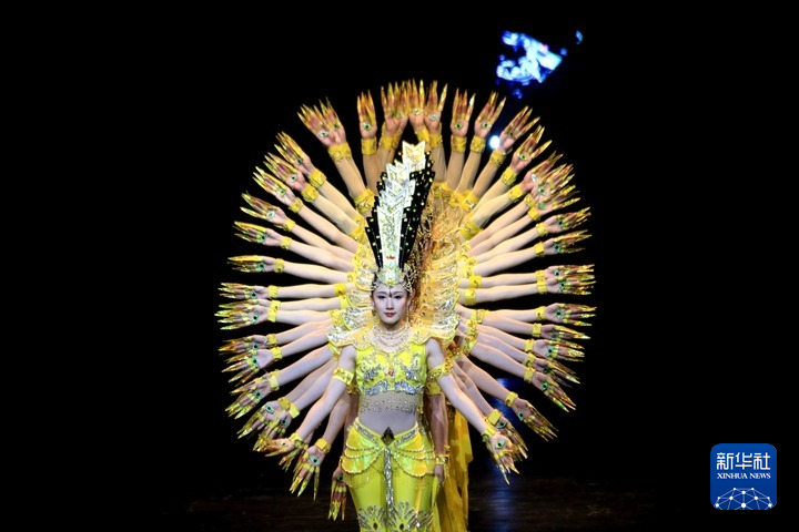 9月10日晚,在甘肅敦煌大劇院,演員在大型情景音畫劇《千手千眼》中表演。新華社發(fā)(張曉亮 攝)