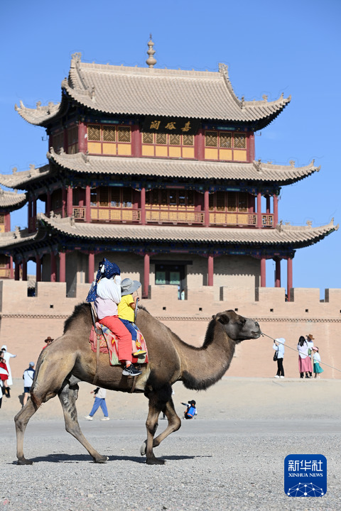 8月7日,游客在嘉峪關(guān)關(guān)城外騎駱駝。新華每日電訊記者 范培珅 攝