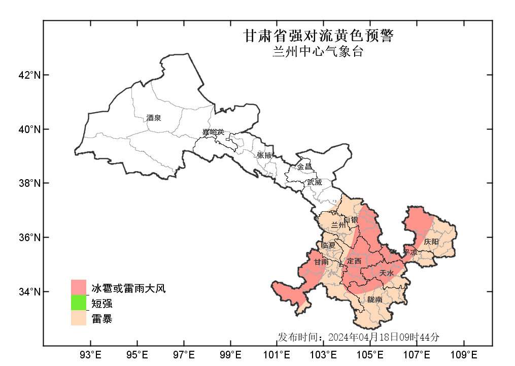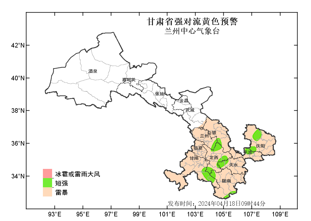 中國甘肅網(wǎng)4月18日訊(西北角·中國甘肅網(wǎng)記者 沈文剛)4月18日9時44分,蘭州中心氣象臺發(fā)布強對流黃色預警:預計今天白天到夜間,武威以東大部分地方有雷暴;其中,白銀、定西、甘南、天水等市州部分地方及蘭州、隴南、平?jīng)?、慶陽等市局部地方有雷雨大風或冰雹;甘南、隴南、定西、天水、白銀、蘭州、平?jīng)?、慶陽等州市局部地方有短時強降水,最大小時雨強為20-30毫米。