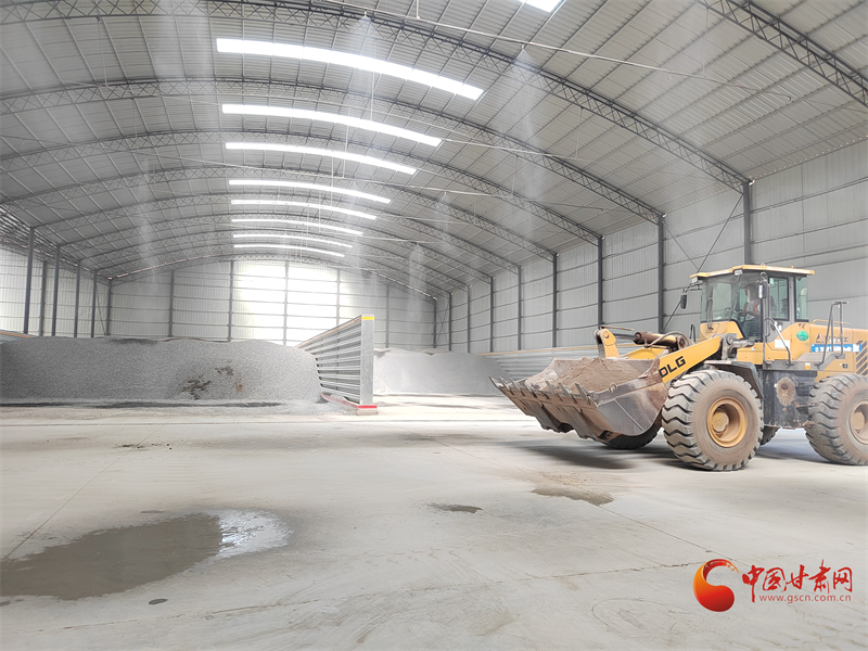 G30忠茅擴容改造項目拌合站儲料車間,一輛輛工程車正在來往穿梭儲備物料。