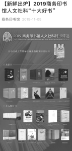 “商務(wù)印書館人文社科好書評選”被中央電視臺等媒體稱為“年度圖書榜單風(fēng)向標(biāo)”。每每公布后,央媒及主流媒體都會予以報道,同時在新媒體平臺也會進(jìn)行系列宣傳,比如2019年的好書評選人民日報官方微信發(fā)布后一天內(nèi)的閱讀量便超過了888萬。