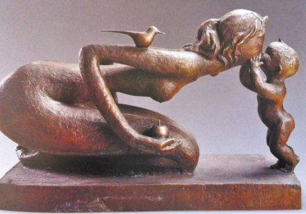 最后的廳,是一批中外馳名的雕塑代表作——從嬌小稚拙掌中把玩的小品到體量龐大高聳入云的巨構(gòu),無(wú)論隨形寫(xiě)意、裝飾寫(xiě)實(shí),美林都在策劃、構(gòu)成、調(diào)整、定型的繁復(fù)過(guò)程中,顯示出扎實(shí)的藝術(shù)功力與非凡的浪漫色彩。其中,龍、虎、馬、牛等動(dòng)物系列,不僅延續(xù)了繪畫(huà)中獨(dú)有的造型風(fēng)格,而且更凝重渾厚,更富裝飾情趣。與眾不同人見(jiàn)人愛(ài)的母子系列中,不論是精心呵護(hù)襁褓嬰兒的母親,匍匐草地引領(lǐng)學(xué)步的母親,牽手寶寶步入校園的母親,造型、肢體的夸張之奇變形之巧,感官、神態(tài)的風(fēng)韻依依顧盼有情,讓人駐足良久再三流連……