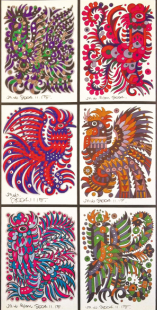 動(dòng)物系列繪畫(huà),從扎實(shí)而靈動(dòng)的速寫(xiě)與設(shè)計(jì)稿直至近似完美的正式作品,都蘊(yùn)含了畫(huà)家捕捉物象的執(zhí)著與機(jī)敏,提煉造型的睿智與不懈,有了心血與摯愛(ài)的投入,那成竹在胸別具一格的小貓小狗小豬小鵝小猴也就躍然紙上呼之欲出了。在長(zhǎng)方形的深色卡紙上,那銀色勾勒的活靈活現(xiàn)的百魚(yú)圖,讓我們沉醉于湛藍(lán)的海洋世界;在四方形的白色鏡框中,那七彩斑斕的百雞圖,讓我們迷戀于鄉(xiāng)間的濃郁風(fēng)情;還有鞠躬盡瘁一生奉獻(xiàn)膂力雄強(qiáng)的牛群系列,馳騁千里挾帶雄風(fēng)英姿勃勃的駿馬圖騰……