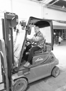 馬曉峰駕駛叉車搬運(yùn)圖書。