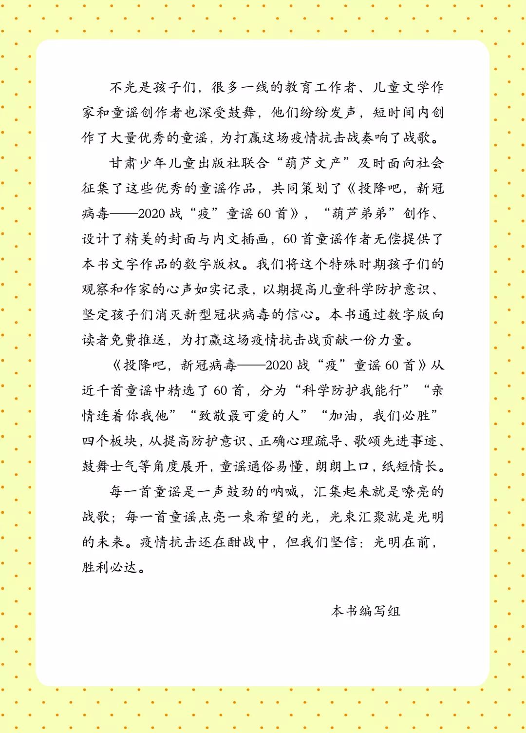 以下為《投降吧,新冠病毒——2020戰(zhàn)“疫”童謠60首》一書(shū)全部?jī)?nèi)容: