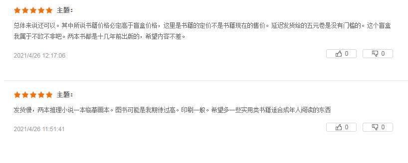 有“歐氣”讀者抽到隱藏款:“等了好久終于收到了,我收到的書都有塑封,不錯不錯,書的豆瓣評分都在七八分左右。”“抽到了隱藏款,開心,是一套推理小說。”;也有人感到書籍不盡人意:“選書有點失望都是舊書的感覺,一本《餌室》,一本《紅色棺材之謎》,有點臟,也能接受,送的文創(chuàng)本子很好看,書袋也不錯,買兩個盲盒都是一樣的文字,不同的顏色,這個有點可惜了。”“發(fā)貨慢,兩本推理小說一本臨摹畫本。圖書可能是我期待過高,印刷一般。”