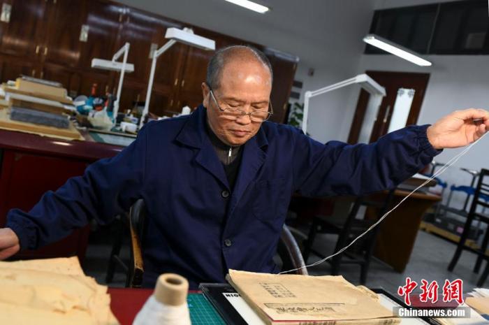 圖為師玉祥將修復(fù)完成的古籍進(jìn)行穿線訂書。 楊華峰 攝