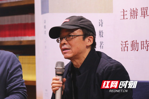“葉舟是在西北行走的邊疆詩(shī)人,頭頂著一片沙漠。”王躍文為現(xiàn)場(chǎng)觀眾解開了葉舟的“帽子之謎”,也不經(jīng)意揭開了一段塵封的“事故”——葉舟曾在西北出過車禍,頭皮里還留著沙子。王躍文說,王絲綢之路曾經(jīng)遍地佛國(guó),“佛性”,正是《詩(shī)般若》的創(chuàng)作母體,“見山是佛,見水是佛,見胡楊林也是佛,見敦煌壁畫上的馬也是佛。”