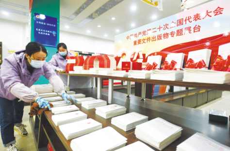連日來(lái),江蘇省連云港市東海縣新華書店精心設(shè)置了黨的二十大重要文件出版物專題展臺(tái),集中展示展銷黨的二十大文件及學(xué)習(xí)輔導(dǎo)讀物,同時(shí)增設(shè)閱讀區(qū),市民可以隨時(shí)閱讀黨的二十大報(bào)告單行本、《黨的二十大報(bào)告輔導(dǎo)讀本》、《中國(guó)共產(chǎn)黨章程》單行本等圖書,吸引了眾多黨員、學(xué)生、市民和機(jī)關(guān)企事業(yè)單位人員等不同群體的讀者前來(lái)閱讀選購(gòu)。