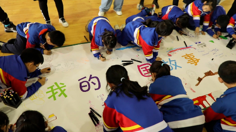 學(xué)生在繪本進(jìn)校園活動中手繪畫布“我的中國故事”