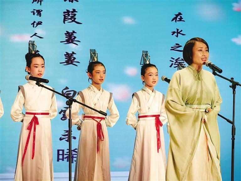 在《壯美山河絢麗詩篇》中,《詩經(jīng)·秦風·蒹葭》在蘭州市東郊學(xué)校曹林老師和方培丞等12位小朋友的演繹下,古風古韻氣息撲面而來。
