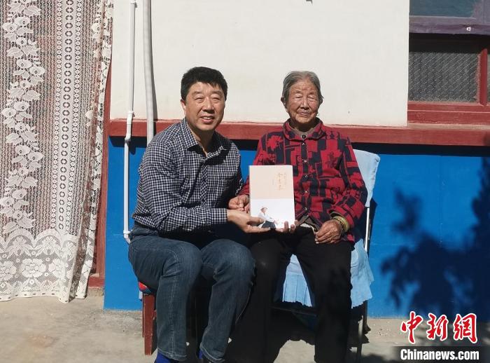 金雷泉拿著其出版作品《我的父親金吉泰》與母親在家中院內(nèi)合影。(資料圖)受訪(fǎng)者供圖