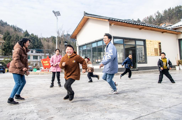 1月24日,在重慶市巫山縣騾坪鎮(zhèn)路口村數(shù)字農(nóng)家書(shū)屋外,“臨時(shí)家長(zhǎng)”和孩子們一起玩游戲。