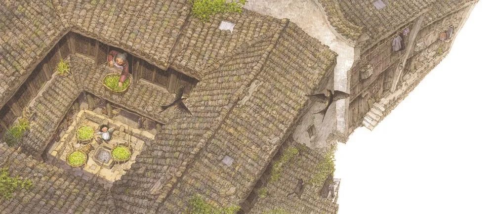 整個繪本主要采用寫實性的現(xiàn)實主義風格,繪畫者付出極大的耐心和精力,用鋼筆和馬克筆細致描繪每一片磚瓦、每一塊石板、每一叢花葉、每一扇門窗,甚至每一條木紋、每一絲波紋、每一道皺紋……力求真實地呈現(xiàn)物像的肌理和質感,讓人身臨其境。同時,也加以寫意的手法,用柔和的淡彩渲染懷舊的色調和溫馨的氛圍。尤其值得稱道的是,在多幅畫面中,以丫丫等待的“神秘的客人”——燕子為一種符號角色,無論之于畫面還是主旨,都有其獨到的意義。燕子飛翔于水面和屋宇之上,給靜態(tài)的環(huán)境帶來靈動之感,有時還能平衡畫面的結構。燕子是江南春天的使者,也是童年喜愛的精靈。蘇軾和歐陽修各自的《蝶戀花》詞中都寫到了燕子,前者是:“花褪殘紅青杏小。燕子飛時,綠水人家繞。”后者是:“畫閣歸來春又晚。燕子雙飛,柳軟桃花淺。”這一古典意象在繪本畫面中的反復出現(xiàn),羽翼間展開了江南的典雅、清麗以及輕愁。作品里的另一種動物是時常縈繞主人腳邊的貓咪,增添了祥和的家居趣味,也代表一種熟稔的情感皈依。原本黑瓦白墻的江南民居在畫面中作為背景或前景,灰中帶彩、冷中帶暖,既體現(xiàn)了時間的流逝,也象征著永恒的家園。外公背著丫丫雨夜歸家的場景以多個連貫畫面變換角度來鋪展,暗夜中始終有溫暖的燈光照亮回家的路,也有堅實的后背托舉稚嫩的夢,給孩子以安全、安穩(wěn)和安心。
