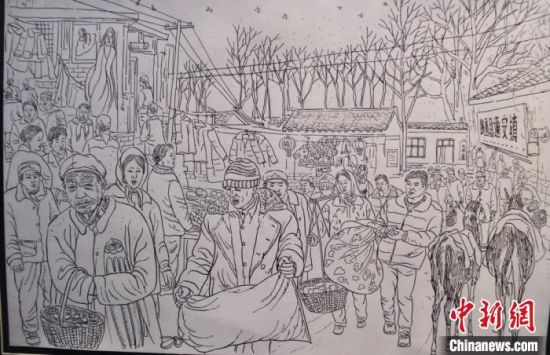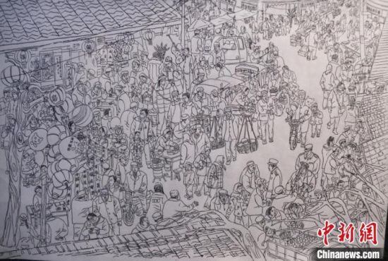 蘭州鋼筆畫愛好者周新平勾勒了數(shù)組關于鄉(xiāng)村記憶的鋼筆畫,其中,《隴西臘月圖》是他歷時三個多月,手繪了200多村民,完成的一幅舊時農(nóng)民過年趕集的熱鬧圖景:賣糖葫蘆的小販、剪紙賀春的手藝人、趕車挑擔的趕集人……周新平說,他很怕“集市文化”將來被人們遺忘,用鋼筆記錄下來,留住記憶里的“年味”以感悟鄉(xiāng)愁。