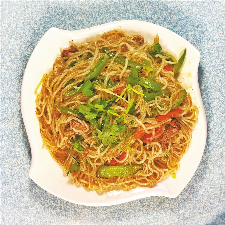 肉末粉條,是一道葷素搭配,鮮香爽口的家常菜。這道菜所用的水粉是由紅薯、馬鈴薯、大豆等原料加工制成的粉條。水粉是臨夏的特產(chǎn),它色白,條細(xì),養(yǎng)分多,適于熬菜,烹炒和涼拌菜用,口感爽滑有韌性,頗受食客喜愛(ài)。