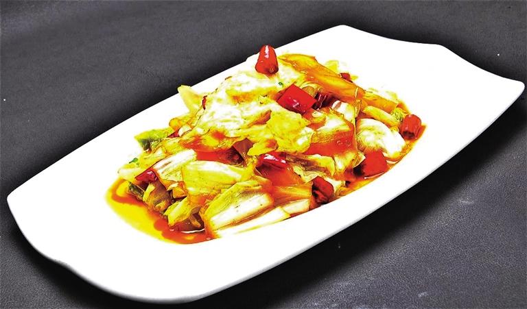 酸辣白菜的食材要選上等的大白菜,剝?nèi)ネ鈱永先~當(dāng)主料。老姜去皮,優(yōu)質(zhì)紅朝天椒泡軟,川椒過(guò)熱水,以白糖、米醋、味精、香油等為輔料。先把白菜切細(xì)條,放入微量鹽,拌勻腌制四五個(gè)小時(shí)后,在涼開(kāi)水中過(guò)一下,撈出控水,放至微蔫。這時(shí),起炒鍋開(kāi)火,冷油放入辣椒、花椒、蔥絲、姜絲,慢慢煎至微微發(fā)黃散出香味時(shí),將油潑在白菜上,最后放入白糖、米醋、味精等拌勻,就大功告成了。