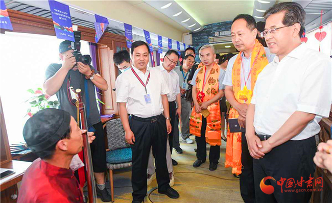 專列到達(dá)西安南站后,陜西省文旅廳及文旅相關(guān)部門對“環(huán)西部火車游”專列的到來表示熱烈的歡迎,陜西省文旅廳負(fù)責(zé)人在甘肅省委宣傳部副部長、省文旅廳黨組書記、廳長陳衛(wèi)中和武威市文體廣電和旅游局負(fù)責(zé)人的陪同下參觀了“環(huán)西部火車游”武威館,并欣賞了國家級非遺項(xiàng)目“涼州賢孝”表演。