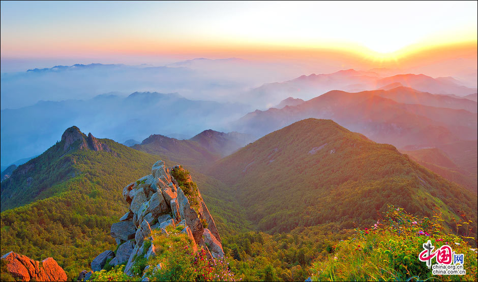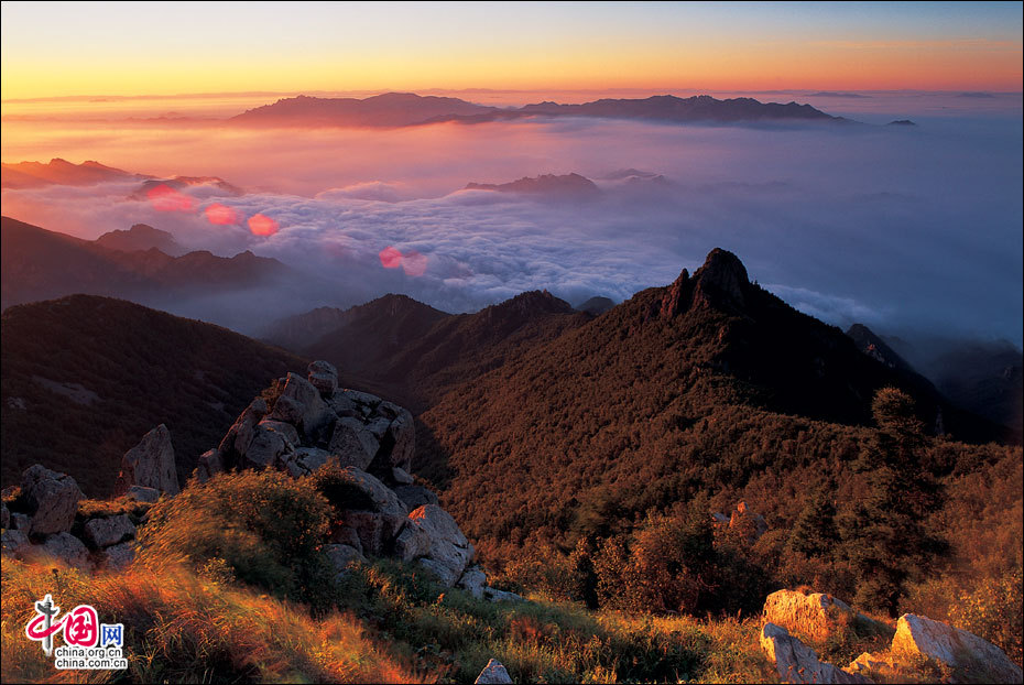 當(dāng)北京的第一縷陽(yáng)光從這里升起。站在海拔2118米的頂峰平臺(tái)上,遙望東方,天際中開始露出幾抹灰色的浮云,隨后不斷地升騰、擴(kuò)大,繼而天邊漸紅,紅色越來(lái)越深,范圍越來(lái)越大,曙光漸露,丹霞輝映,把整個(gè)東方都變成濃濃的紅色。山峰在云霧中時(shí)隱時(shí)現(xiàn),彩云在天際間變幻,有時(shí)像奔馳的駿馬,有時(shí)像仙女飄逸,有時(shí)像玉樹瓊宮……千姿百態(tài),遐想無(wú)窮。猛然,比紅色的彩云更火紅、更光亮、更鮮艷的太陽(yáng)露出了一條邊弧,緩緩上升。四周的云霧似乎忍受不了她那光茫的照射而淡化、隱退,太陽(yáng)則很快掙脫了云霧與夜色的纏繞,迅速地上升,躍出天邊。霎時(shí),一輪紅日噴薄而出,金光四射,霞光瑞氣,照徹天宇,山巒、萬(wàn)樹沐浴著朝陽(yáng)的金輝,令人眼花繚亂。舉目四望,朝霞映照下的霧靈山,群峰起伏,云霧如海,波濤洶涌,九曲十八彎的旅游公路似戲水游龍,在峰巒間若隱若現(xiàn)。