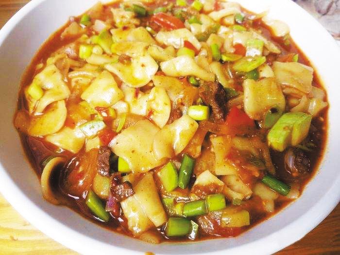 蘭州尕面片可炒可燴,要么加入肉丁、木耳、青菜、粉條燴制,要么只是西紅柿、菠菜,清清爽爽。尕面片薄厚均勻,筋道爽滑,湯汁咸鮮酸甜,口味層次豐富,老少咸宜。
