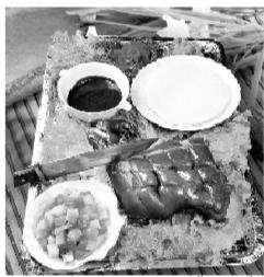 將蕨麻豬除去內(nèi)臟和頭蹄,然后內(nèi)涂調(diào)料,外裹泥巴,埋入無煙的牛糞火堆中炙烤,至泥呈褐黃色時,豬毛隨泥巴脫落,即可放入大盤,配以佐料,用刀切割而食,肉嫩皮脆,鮮香無比。