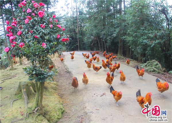 茶花具有“唯有山茶殊耐久,獨(dú)能深月占春風(fēng)”的傲梅風(fēng)骨,又有“花繁艷紅,深?yuàn)Z曉霞”的凌牡丹之鮮艷,因此自古以來就是極富盛名的木本花卉,在唐宋兩朝達(dá)到了登峰造極之境,直到十七世紀(jì)引入歐洲后,造成轟動(dòng),也因此獲得“世界名花”的美名。九龍街道牛街居委會(huì)小寨土雞生態(tài)產(chǎn)業(yè)園嬌艷的茶花給人一種神圣感,同時(shí)被賦予了一種原始的信仰:山茶是春天的神木,是春天的圣樹。置身九龍小寨土雞生態(tài)產(chǎn)業(yè)園,來一場(chǎng)與森林的浪漫邂逅,恍如仙境。園里有枇杷林、櫻桃林、楊梅林、梨樹林、紅豆杉林、柏樹林、椿樹林、油桃林、核桃林、灌木林以及草莓園、蔬菜園、山茶花園、荷花園,樹下是一群群羽毛鮮亮的土雞悠閑地覓食,好一幅田園風(fēng)景畫!