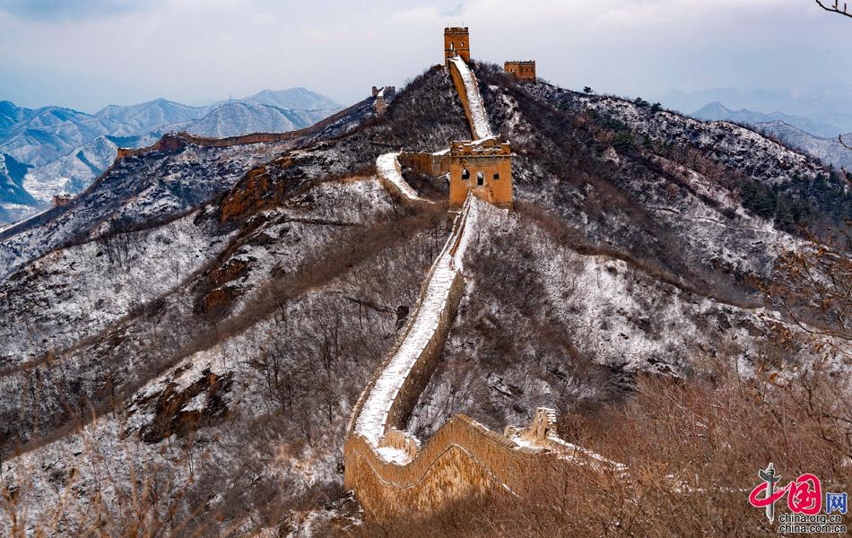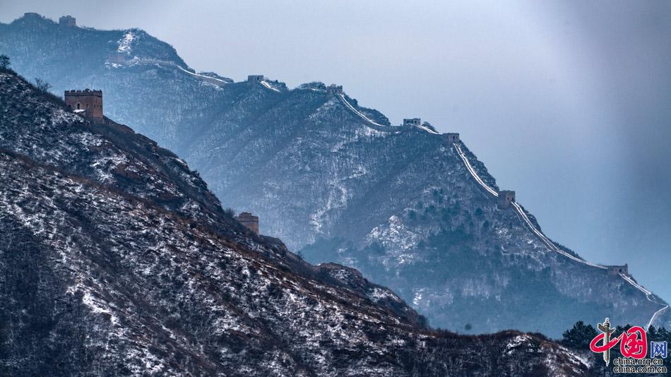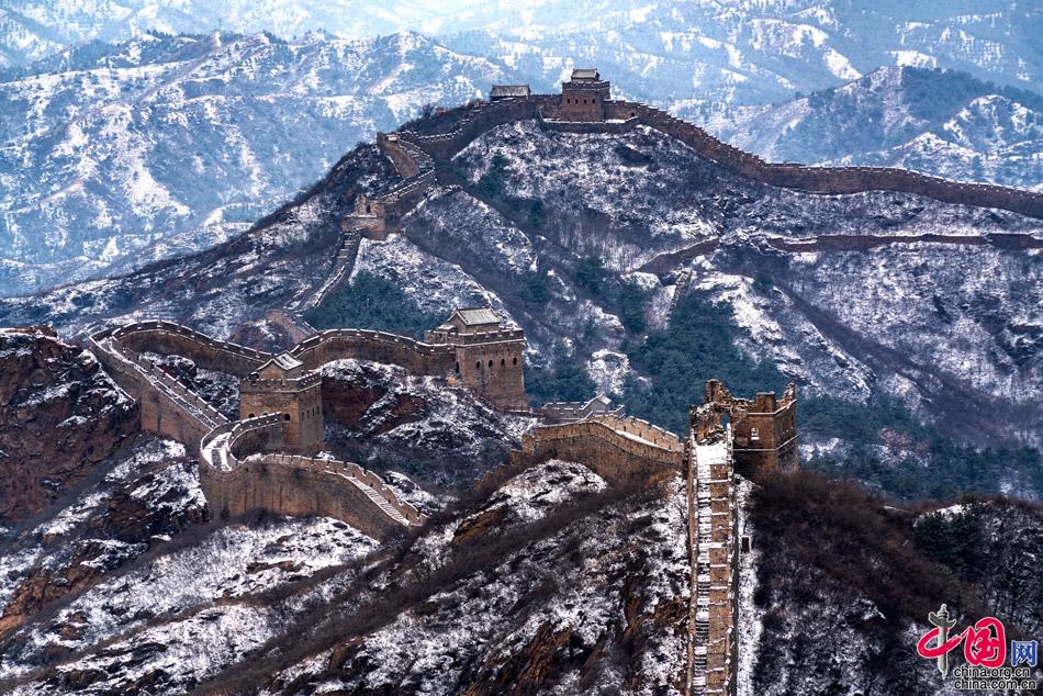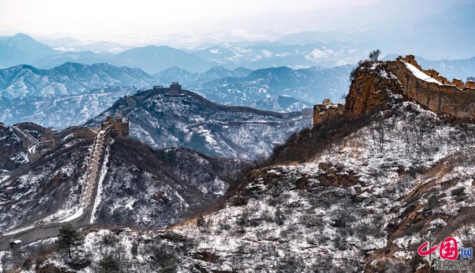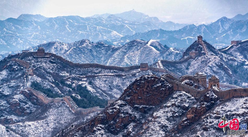 在春雪覆蓋下,山巒起伏,壯觀(guān)的長(zhǎng)城在崇山峻嶺之巔如巨龍飛舞,一幅雪墨丹青,令人向往。