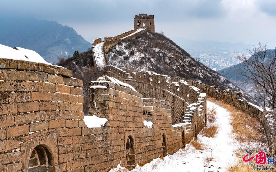 春雪飄灑,一朵朵相擁著落下,氣溫驟降,給人帶來(lái)一絲涼意。金山嶺海拔700米,長(zhǎng)城依山憑險(xiǎn),起伏跌宕于山水之間,形勢(shì)極為雄奇。金山嶺長(zhǎng)城是明代修筑的一段長(zhǎng)城,西起歷史上著名的關(guān)口古北口,東至高聳入云的望京樓,全長(zhǎng)10.5公里,沿線(xiàn)設(shè)有大小關(guān)隘5處,敵樓67座,烽燧2座,因其視野開(kāi)闊,敵樓密集,景觀(guān)奇特,建筑藝術(shù)精美,軍事防御體系健全,保存完好而著稱(chēng)于世。