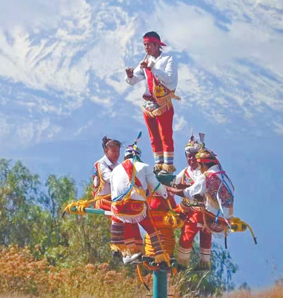 這些舞者表演的是墨西哥傳統(tǒng)的“飛天舞”儀式。“飛天舞”在墨西哥韋拉克魯斯州的托托納克人中盛行,現(xiàn)已成為該州帕潘特拉市代表性的文化標(biāo)志。2009年,這項(xiàng)民間技藝被聯(lián)合國教科文組織列入人類非物質(zhì)文化遺產(chǎn)代表作名錄。