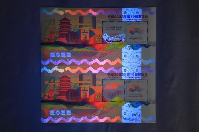 據(jù)了解,《杭州2022年第19屆亞運(yùn)會》特殊版式個性化郵票雙連張是中國集郵有限公司匠心打造的首款GPZ編號體育題材郵票,由青年設(shè)計師趙郁竹擔(dān)綱設(shè)計,限量發(fā)行。它依托杭州亞運(yùn)會色彩系統(tǒng)和視覺形象元素,融歷史文化、現(xiàn)代美學(xué)和未來暢想于一體,集藝術(shù)感、科技感和運(yùn)動感于一身,展現(xiàn)中華文明、浙江風(fēng)采、杭州韻味和時代魅力,采用特殊版式、編號和工藝,紫光燈下局部呈現(xiàn)無色熒光油墨圖案和全真彩效果,傳遞中國郵政對杭州亞運(yùn)的美好祝福。(圖片由人民日報客戶端提供)