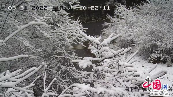 從山上到山下,景區(qū)皆是一片白雪皚皚,白雪覆蓋在冒出的新芽之上,翠綠的森林被雪披上了一層潔白的紗衣,增添了許多詩情畫意,別有一番風(fēng)情。