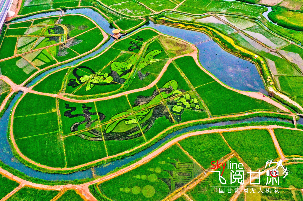 7月13日清晨,一場(chǎng)小雨過(guò)后,張掖市甘州區(qū)烏江鎮(zhèn)新河田園綜合體稻田景觀區(qū)內(nèi)2000多畝稻田塵埃盡洗,一幅幅彩稻畫(huà)栩栩如生,從高處俯瞰,田園風(fēng)光和生態(tài)美景展現(xiàn)在人們眼前。