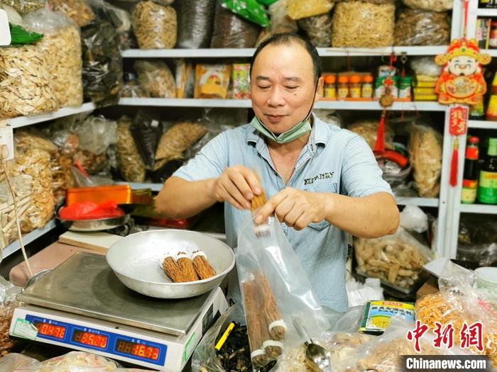 資料圖為廣東臺(tái)山富城市場(chǎng)內(nèi),一藥材檔的老板為顧客用密實(shí)袋打包參絲。 中新社發(fā) 李曉春 攝