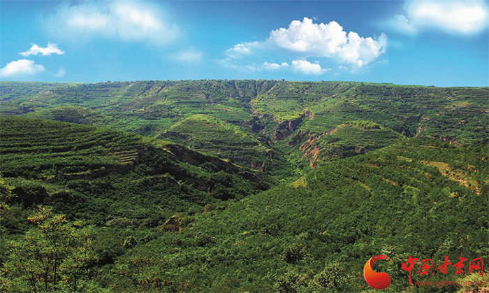 站在田家溝梁峁山巔望去,一路向北沿著蜿蜒的山道,一幅偌大的山水畫呈現(xiàn)在眼前。藍天白云下,青山綠水、林苑疊嶂。