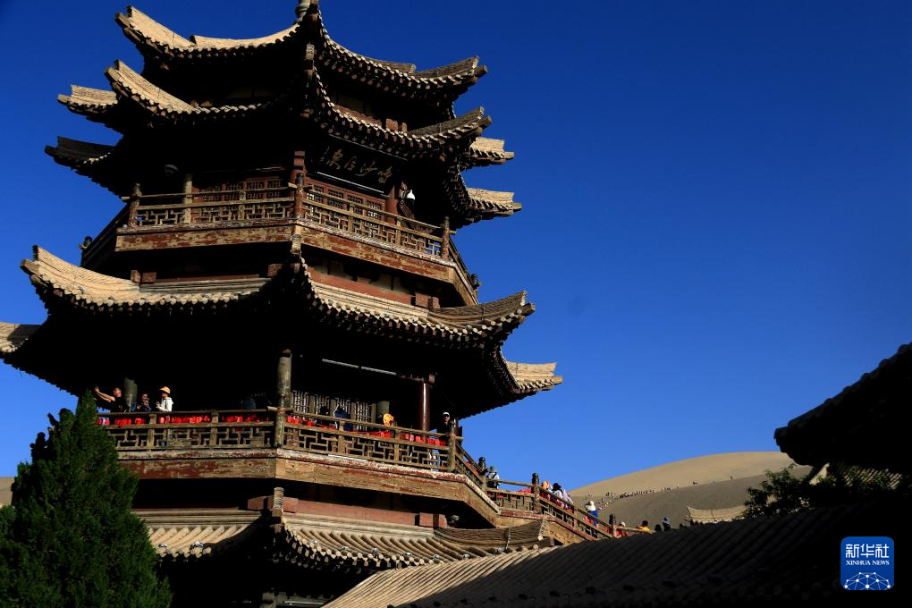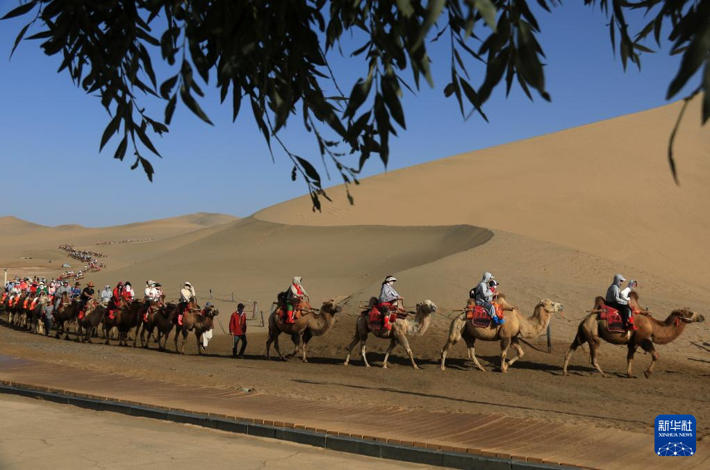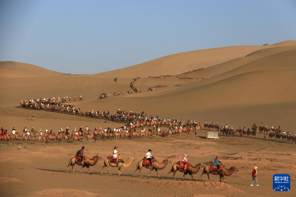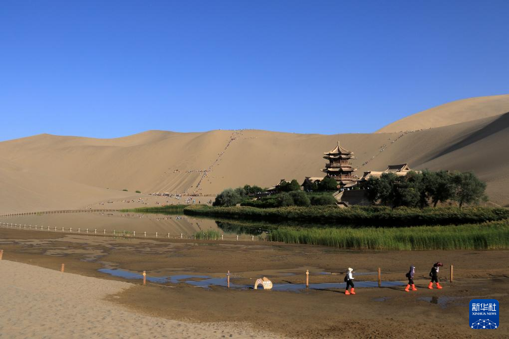 初秋時節(jié),甘肅省敦煌市碧空如洗,鳴沙山月牙泉景區(qū)景色如畫,引人入勝。