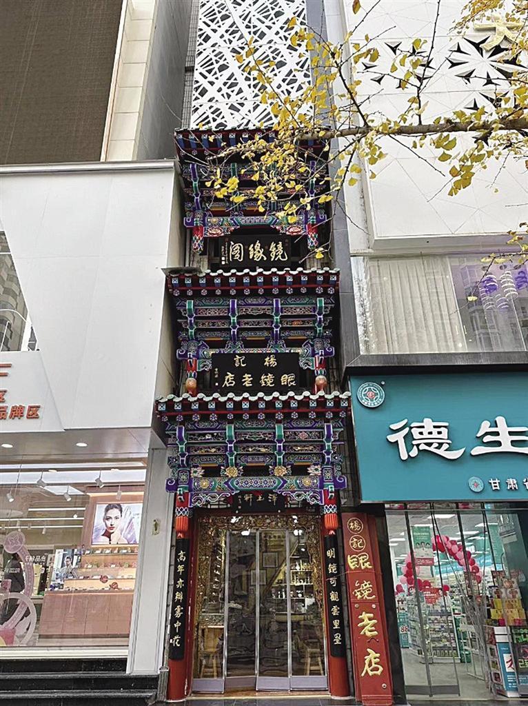 榫卯鑲嵌、手工木雕、精致彩繪、金箔貼邊,在張掖路步行街上,楊記眼鏡行的門樓招牌格外亮眼,雖然只有三四米寬的窄小門面,但店外從上而下的三塊古韻招牌彰顯出這家店的“不簡(jiǎn)單”。“最下面這塊‘澤玉軒’的招牌是我家祖輩楊澤玉開(kāi)創(chuàng)這家眼鏡行時(shí)留下的字號(hào)”,楊記眼鏡行是蘭州一家老字號(hào)的石頭眼鏡售賣和維修小店,光是制作修理石頭眼鏡這項(xiàng)手藝就已經(jīng)傳到了第五代,其店鋪在二十世紀(jì)八九十年代就獲得過(guò)商務(wù)部的“中華老字號(hào)”認(rèn)可。