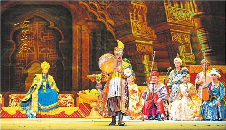 全劇主體部分由“佛門”“一念”“潛關(guān)”“問路”“遇險(xiǎn)”“極樂”“高昌”“普度”“雪山”“祭天”“菩提”“那爛陀”“如夢”“大唐”14個(gè)章節(jié)構(gòu)成。每一個(gè)章節(jié)都把樂器與故事相結(jié)合,推動情節(jié)發(fā)展,表現(xiàn)人物內(nèi)心,從漢族傳統(tǒng)樂器笛、簫、塤、箏、鼓,到維吾爾族樂器艾捷克、薩塔爾、都塔爾,哈薩克族樂器冬不拉、庫布孜,塔吉克族樂器鷹笛、莎什塔爾,還有敦煌復(fù)原樂器箜篌、排簫、五弦琵琶,印度傳統(tǒng)樂器班蘇里笛等,呈現(xiàn)出來的樂器數(shù)量,令人驚嘆。據(jù)姜瑩介紹,全劇共演奏中外傳統(tǒng)樂器70余種。在舞臺呈現(xiàn)上,多媒體技術(shù)、舞美、燈光及服裝的綜合運(yùn)用,情景交融,新穎而獨(dú)特,給人一種身臨其境的真實(shí)感,沿著玄奘前行的足跡,大漠、星空、雪山……如在眼前。此外,劇目跨越時(shí)空,讓老年玄奘和青年玄奘隔空對話,將遼闊的時(shí)空壓縮于舞臺一瞬,以強(qiáng)烈的穿透力給觀眾以心靈上的啟迪和震顫。高昌王以樂會友部分,演奏人員從觀眾席上的出場,既讓人驚喜,也是一種沉浸式的觀看體驗(yàn),強(qiáng)烈的互動性和感染力,點(diǎn)燃了觀眾的熱情。